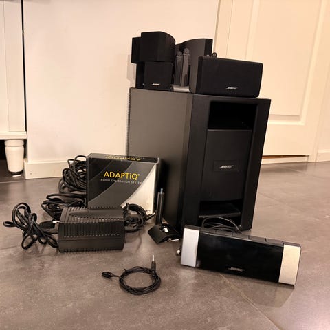 Bose AV35 hemmabiosystem i svart utförande. Systemet består av en AV35 control console, flera kompakta högtalare, fjärrkontroll, strömadapter och kablar enligt bild. Avsett för hemmabio- och TV‑ljud med flerkanalsuppspelning. Passar för anslutning till TV och andra ljud- och bildkällor via kontrollenheten. Systemet är utformat för inomhusbruk och kan placeras i vardagsrum eller medieutrymme där man önskar flerkanalsljud från en separat förstärkare/receiver enligt Bose‑specifikationer för AV35‑modellen.
