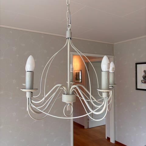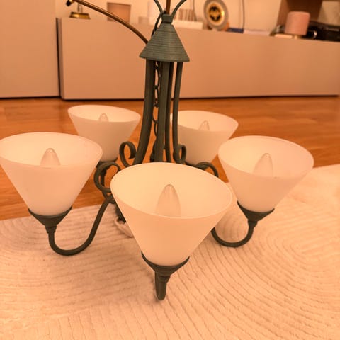 Taklampa i blått smidesjärn med kupa av frostat glas, för elektrisk belysning. Med plats för sex stearinljus. L-TEAM.
