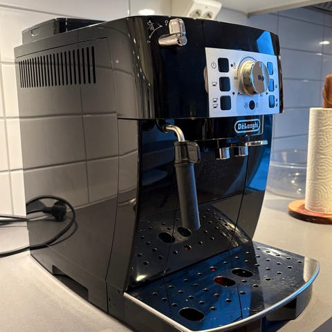 Avtagbar droppbricka och galler underlättar rengöring. På sidan finns en genomskinlig vattentank som kan tas ut för påfyllning och rengöring. Ovanpå maskinen finns utrymme för bönbehållare och reglage för malningsgrad.