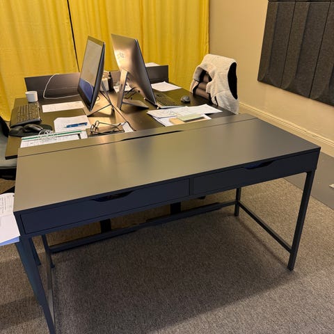 Jysk skrivbord med förvaring i grått. Skrivbordet har en skiva monterad på ben/fästen (sakans skruv på ett av fästena) ovanpå en förvaringsdel med öppna hyllplan och ett skåp med dörr. Förvaringsdelen rymmer flera hyllplan som kan användas för exempelvis pärmar, böcker eller kontorsmaterial. Passar som arbetsplats i hemmakontor, tonårsrum eller vardagsrum där extra förvaringsutrymme önskas under skrivbordet.