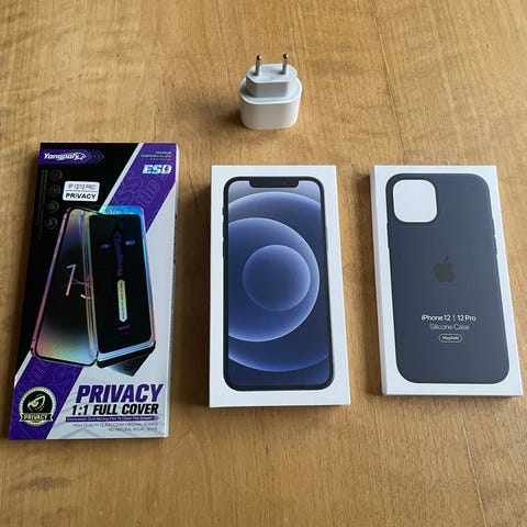 Svart iPhone 12 128 GB intern lagring med låda, laddkabel och originalskal i läder.