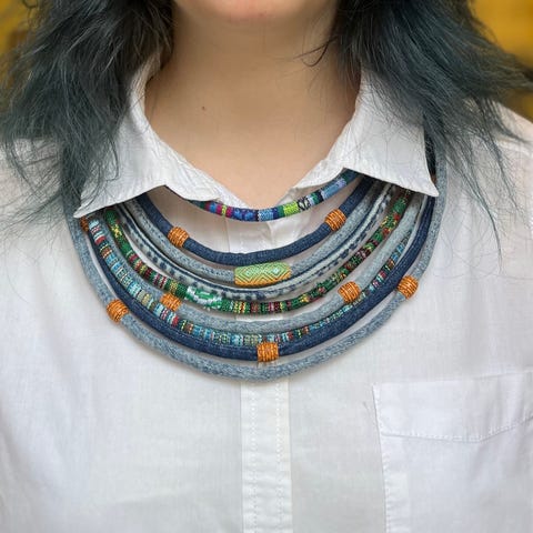 Halsband tillverkat av jeans, handgjort. En underbar dekoration i en avslappnad stil. Väldigt snyggt med jeanskläder.
