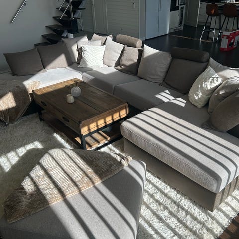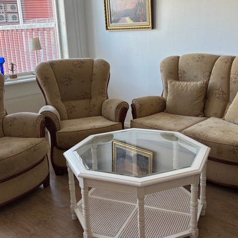 En behändig soffgrupp i nyskick säljes under halva priset. Modern beige färgton med ben i massiv oljad valnöt.