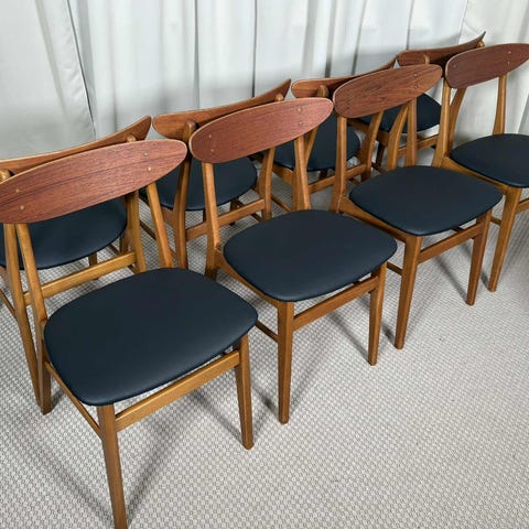 Säljer fyra fina stolar i teak troligtvis 1950/60-tal. Stolarna har ej originalklädsel utan är omklädda i tyg från Svenskt Tenn, Josef Franks tyg Exotic Butterfly. Stolarna är stabila och i bra skick. Tyget är något solblekt och i använt skick.