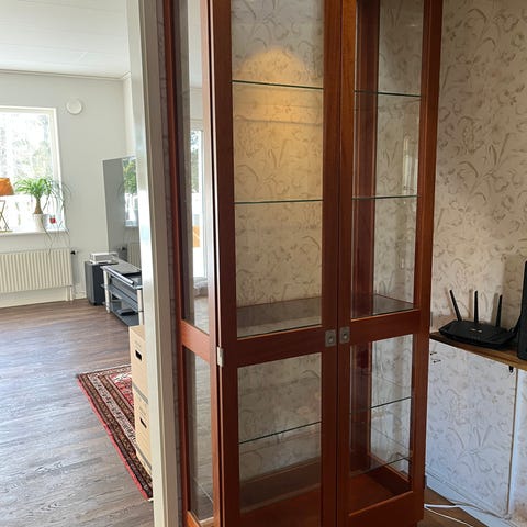 Mått enligt bild: cirka 103 cm bredd, 47 cm djup och 141 cm höjd. Passar som vitrinskåp i vardagsrum, matsal eller kök.
