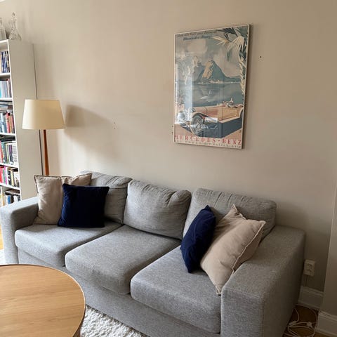 Soffa 3-sits i mörkgrått tyg. Modellen har 2 sittdynor och 2 ryggdynor samt två lösa kuddar. Raka armstöd och neutralt utförande som passar i vardagsrum eller tv-rum. Sits- och ryggdynor är stoppade för normal sittkomfort. Soffan står på korta ben som ger en stabil bas.