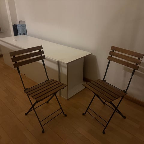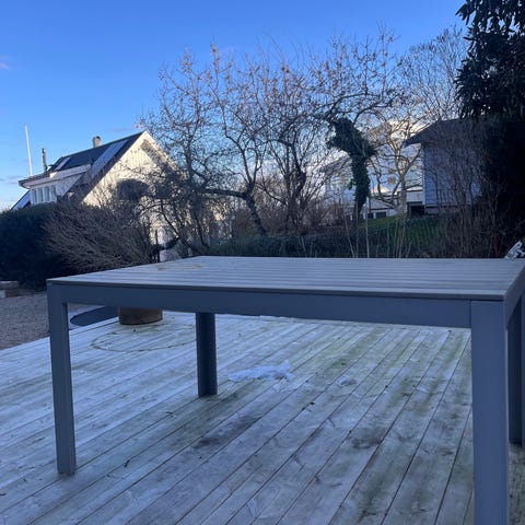 Hopfällbart bord i brunt trä med ribbad bordsskiva. Bordet har kryssben som kan fällas ihop för enkel förvaring. Passar exempelvis på balkong, altan eller i trädgård som mat- eller avlastningsbord. Bordet har stått under tag på balkong sommarmånaderna och övrig tid har det förvarats inomhus.