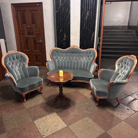 Nobilis - fyra fåtöljer i brun sammet med hjul/nitar