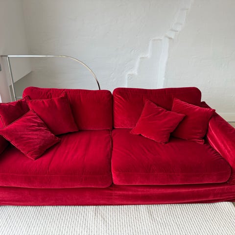 Som sagt perfekt att sammeten går att tvätta i maskin, men mindre perfekt att min dotter ställde sin målarfärg på vänstra armstödet som man inte kan tvätta, se bild. Jag har skrubbat med galltvål men inte ansträngt mig mer än så. Det är gouache-färg så det BÖR gå bort, men kanske goast att skaffa denna om man har barn eller katt och ändå är beredd på kaos.