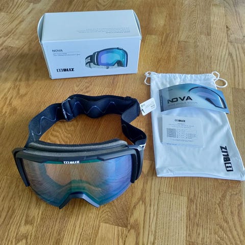 EQPE skidglasögon med blå-lila spegellins och svart justerbart band. Nyskick använts 2-3 gånger. Inte synligt använda och alltid förvarade i skyddspåse som medföljer.