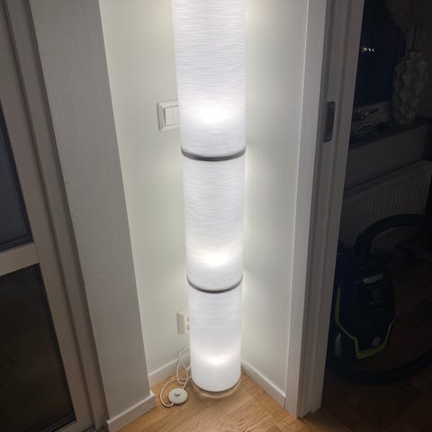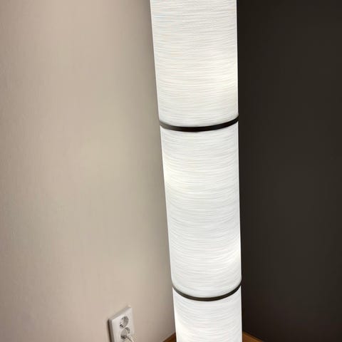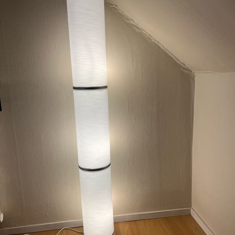 3 golvlampor med cylinderformade lampskärmar i pappmaterial.