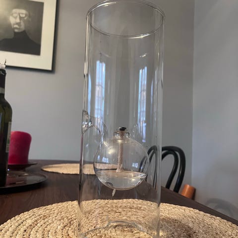 Stelton oljelampa i kombination av glas och metall. Lampan har en cylindrisk glascylinder upptill och en stabil metallfot nedtill. Avsedd för användning med lampolja och ger ett riktat, stilla sken. Passar som dekoration inomhus eller utomhus på exempelvis bord eller fönsterbräda.