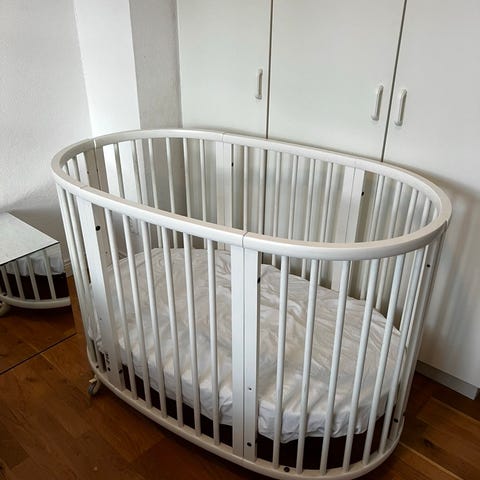 Stokke spjälsäng i oval form i grått. Spjälsängen har rundade hörn och täta spjälor runtom för att ge en ombonad sovplats för spädbarn och småbarn. Passar för användning i barnrum eller sovrum som första säng. Sängen är oanvänd och därmed i nyskick.