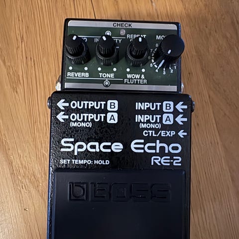 Boss Tera Echo TE-2 gitarrpedal i originalask. Effektpedal med eko- och rymdliknande delayeffekter även sång, synth med flera andra instrument. Utrustad med dubbla ingångar (Input A/B) och dubbla utgångar (Output A/B) för mono- eller stereokonfiguration. Pedalen har inbyggd fotbrytare och rattar för att justera effektens nivå och karaktär. Passar för användning i pedalbord tillsammans med andra gitarr- och förstärkarutrustningar.