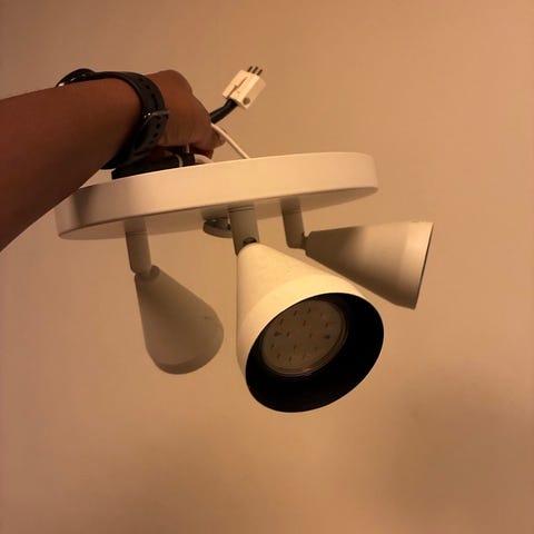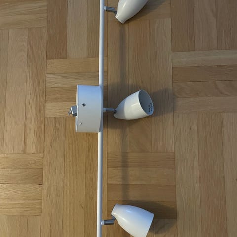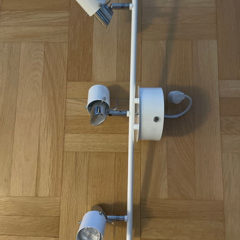 Ellos takspot med skena i vit metall. Lampan har flera riktbara spotlights monterade på en rak skena, vilket gör det möjligt att rikta ljuset åt olika håll i rummet. Avsedd för montering i tak med elkoppling enligt bilderna. Passar exempelvis över matbord, köksbänk eller i hall där riktat ljus behövs.