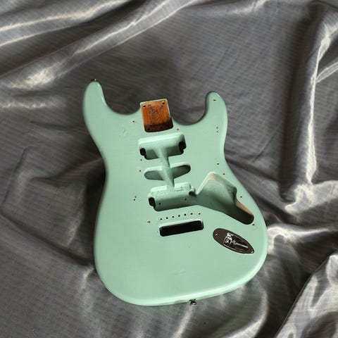 En Warmoth Strata hals i bra skick. Lönn med mörk rosewood greppbräda och pärlemorinlägg. Radius är 12"-16". Halsen har ett rätt smalt grepp och är gammal, troligen tidigt 80-tal. Tidigare ägare har satt på en Boogie Bodies dekal, då det fanns en koppling mellan Warmoth och det märket under slutet av 70-talet.