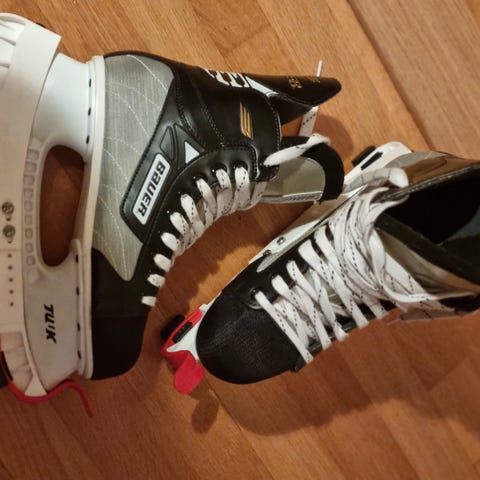 Bauer Vapor ishockeyskridskor i svart och vit färg. Klassisk snörning framtill och stabil hälkappa. Uppskattad storlek 43-44. Innermått:27,8 cm