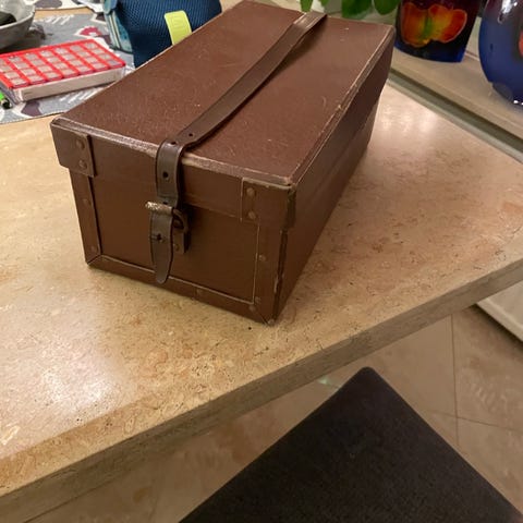 Trälåda med handmålat blommotiv på locket i bruna, gula och gröna toner. Insidan av locket är dekorerad med samma motiv. Lådan är rektangulär med fyra små fötter undertill. Ytan visar spår av slitage, särskilt på lockets kanter. Passar som förvaringslåda eller dekoration i hemmet.