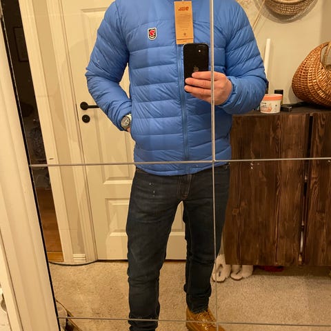 Fjällräven dun vinterjacka för herr i storlek M. Jackan är blå och fylld med dun, vilket ger god isolering under kalla vinterdagar. Modellen har huva och genomgående dragkedja framtill. Passar som ytterplagg vid vardagsbruk och utomhusaktiviteter under vintersäsong.