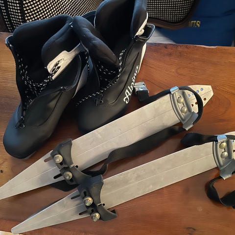 Everest Nordic Keskskate skridskor med tillhörande kängor i storlek 38och storlek 41. Paketet innehåller nordiska långfärdsskridskor (540 mm enligt kartong) och ett par 480 mm samt två par Everest-kängor anpassade för användning med skridskorna. Kängorna är höga vandrings-/skridskokängor med snörning och kraftig sula. Färgerna på kängorna är svart respektive mörkbrun. Ett par isduppar.