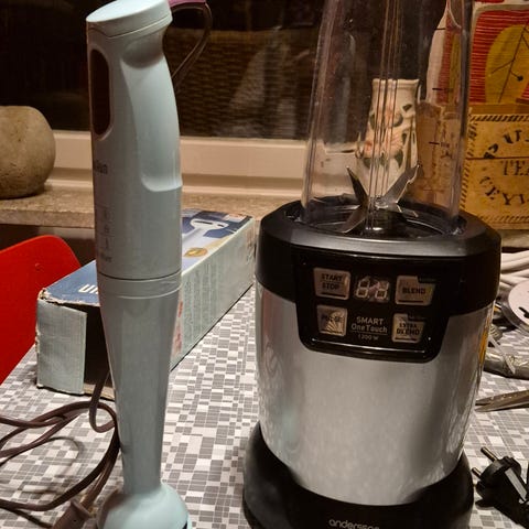 En mixer för främst för smoothies. Lite delar saknas så som locket med en öppning så man kan dricka. Vill man ha med sig den så får man tyvärr använda skruvlocket med bladen.