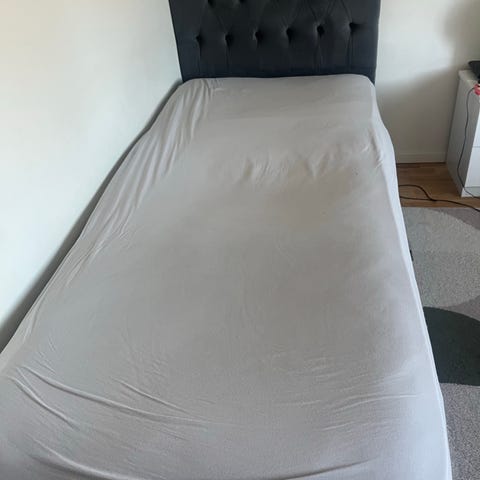 Mio säng med vit madrass. Sängen har en quiltad madrassyta med rutmönster. Passar som enkelsäng i sovrum eller gästrum. Exakta mått och modell kan anges av säljaren vid behov. Sängar kan sät ihop att användas som dubbel säng .