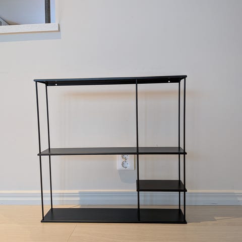Svart vägghylla i trä och metall. Solitt hyllplan i trä och metallram med fästen för upphängning.