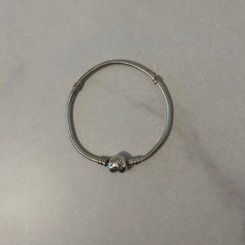 Pandora armband för kvinna i silver. Styvt armband med dekorativt hjärtformat detaljerat lås.