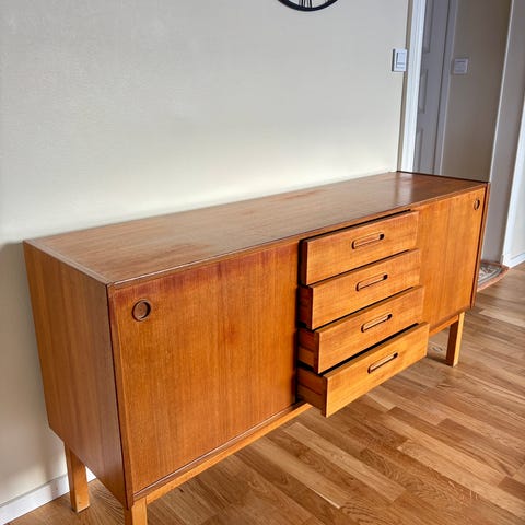 Retro sideboard i teak, 50/60 tal. Tyvärr har ena dörren färgskiftningar, se bilder. Skulle säkert bli fin om någon vill slipa hela dörren.