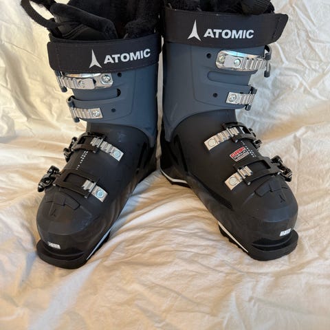 Atomic Hawx 100 alpina pjäxor i svart och röd färg. Pjäxorna har fyra justerbara spännen framtill och kraftigt hälspänne för stabil passform. Sulan är mönstrad för grepp vid gång. Flexindex är 100 enligt märkningen på skaftet. Lämpliga för alpin åkning i pistsystem med standard alpina bindningar. Endast använde 1 säsong