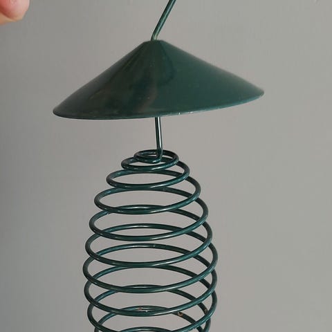En hängande fågelmatare i metall, avsedd för talgbollar eller nötter