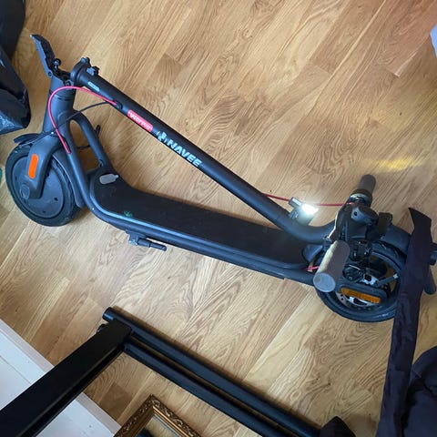Navee V40i Pro elsparkcykel i svart färg. Modellen är hopfällbar och har ståplatta, fram- och bakhjul med däck anpassade för stadskörning samt handtag med reglage på styret. Elsparkcykeln drivs av elmotor och levereras med laddare enligt bild.
