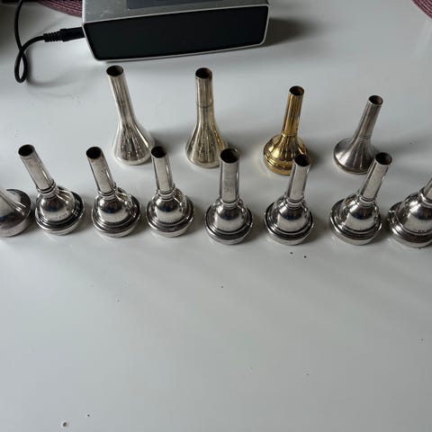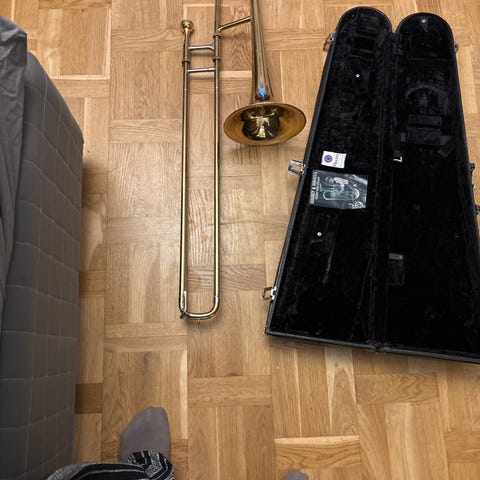 Bach trombon tb200 i mässing. Instrumentet levereras i hårt etui med plats för trombonens delar. Två munstycken ingår. Bra skick!