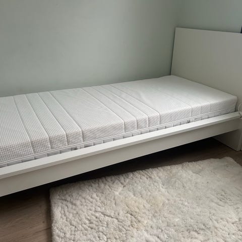 En resårbotten som alltid haft skydd över sig. Modell Skotterud från ikea nypris 2595kr. Med bäddmadrass och kuddar kan medfölja
