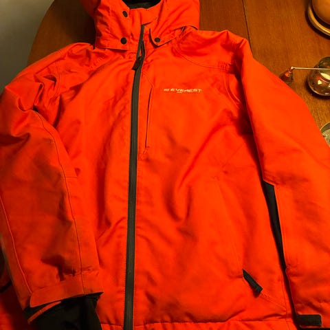 8848 Altitude jacka i storlek S. Jackan är orange och har huva samt hel dragkedja framtill. Bröstficka med dragkedja och två större fickor framtill.