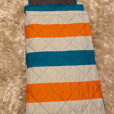 Sovsäcks täcke i rött tyg med blommönster. Utsidan har ett mönster med vita blommor och små prickar, insidan är enfärgad mörk. Sovsäcken stängs med kraftig dragkedja framtill. Kan även användas som vanligt täcke om dragkedjan öppnas. Lämplig för inomhusbruk, övernattningar eller extra täcke.