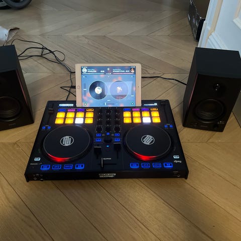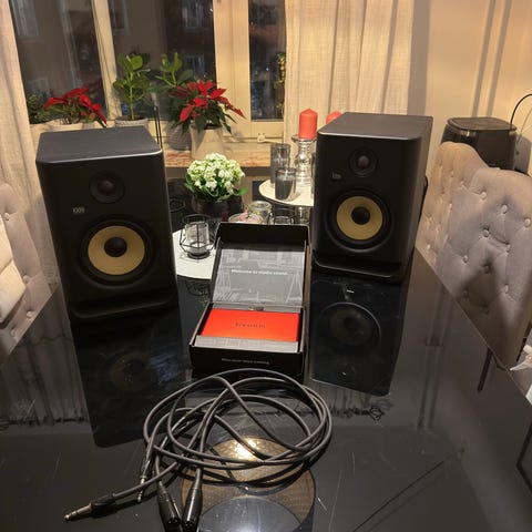 2 st KRK Rokit 5 studiomonitorer tillsammans med Native Instruments Komplete Audio 2 USB-ljudkort och och diverse kablar och sladdar som behövs för att koppla in allt och få det att fungera.
