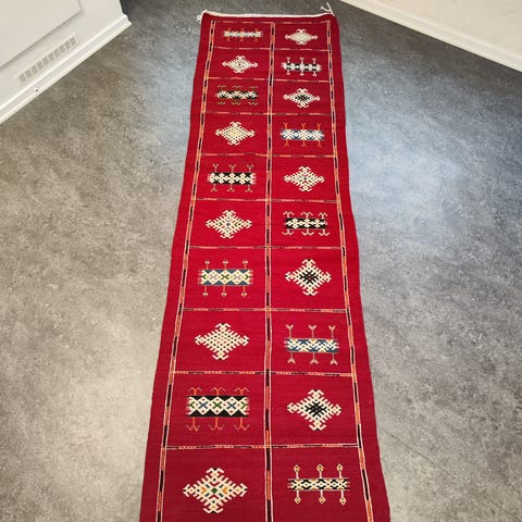 Denna matta från Ait Oughrda, Marocko, är en konstnärlig skatt. Skickligt vävd med noggrannhet i detaljerna, pryds mattan av harmoniska färger och intrikata mönster. Användningen av högkvalitativa material förstärker dess textur och hållbarhet, vilket gör den till ett tidlöst tillskott i vilket rum som helst. Denna Ait Oughrda-matta berikar inte bara inredningen utan bär även på kulturarvet och skickligheten från sitt ursprung.