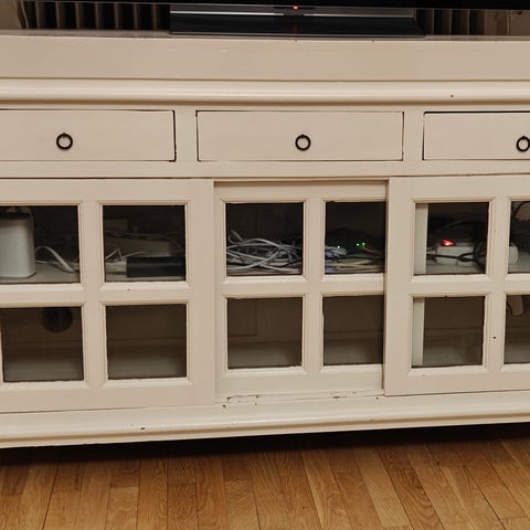 Sideboard/skänk i vitbeige trä med vitrindörrar och mörk topp