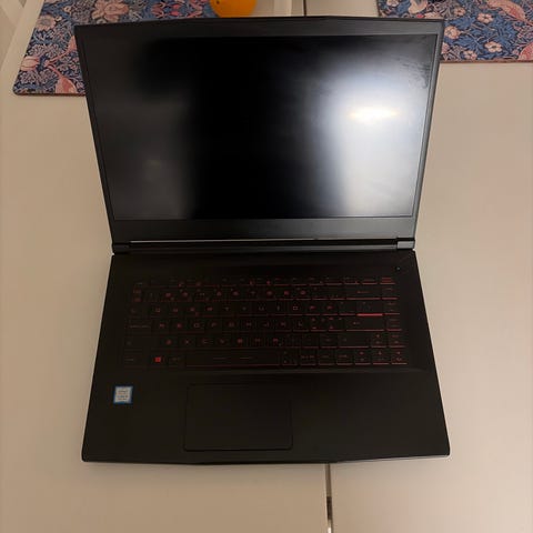 MSI bärbar dator i svart utförande. Datorn har fullstort tangentbord med numerisk del och röd bakgrundsbelysning samt en större pekplatta placerad under tangentbordet. Skärmen är i widescreen-format och chassit är i mörk färg med MSI-logotyp på locket. Lämplig för allmän användning som arbete, studier, gaming och underhållning beroende på intern hårdvara och konfiguration.