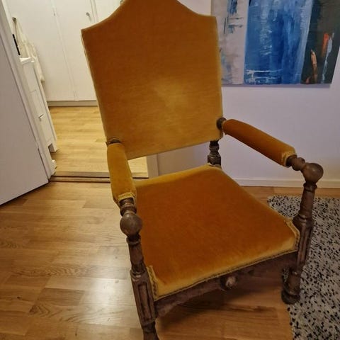 Vacker och stabil stol i massivt trä med klädd sits och rygg. Stolen har en tidlös design med fina detaljer, bland annat dekorativa möbelspikar och snidade ben som ger ett exklusivt intryck. Klädseln går i en neutral, varm ton som passar lätt in i både klassiska och moderna hem.