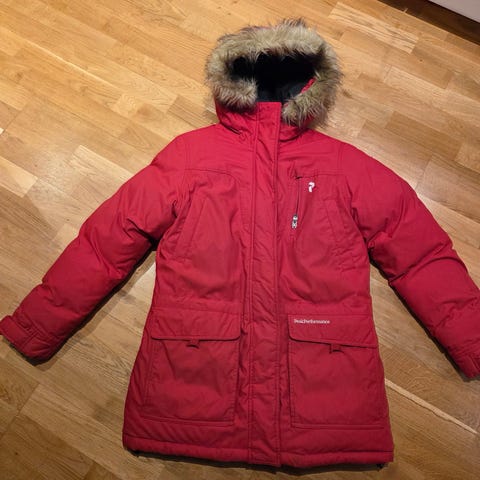 Snygg och varm vinterjacka från Peak Performance i klassisk design. Jackan är ljusgrå med röda och vita detaljer samt Peak Performance-logga på bröstet. Vadderad/dunfodrad och perfekt för kalla vinterdagar. Modellen har huva, dragkedja framtill, praktiska fickor och en sportig passform. Passar lika bra till vardags som till skidresa eller friluftsliv. Storleken är medium. Den är i gott använt skick. Skicka bara meddelande ifall ni undrar något mer.