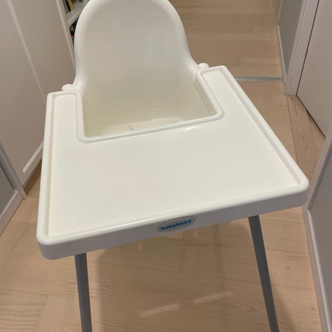 2 st IKEA Antilop barnmatstol i vit plast med grå metallben. Den ena med bricka den andra utan bricka.