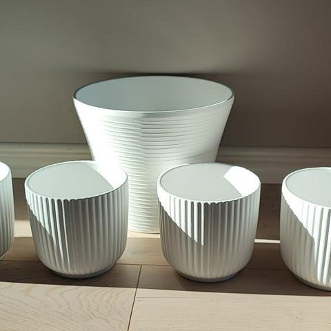 Vit kruka i keramik med diskret strukturerat mönster på utsidan. Passar för inomhusväxter och kan användas som ytterkruka. Neutralt utförande som fungerar i olika rum och inredningsstilar.