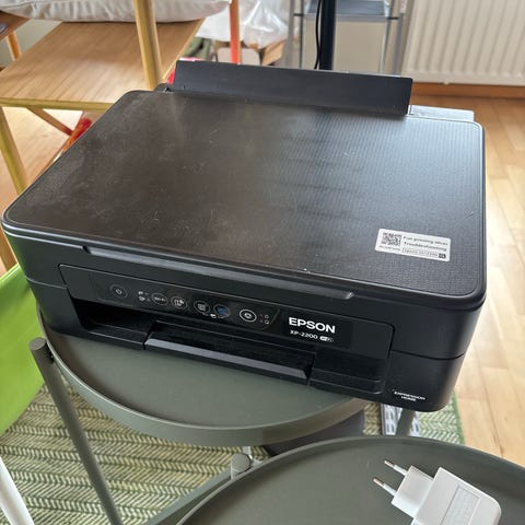 Epson Stylus SX105 multifunktionsskrivare i svart utförande. Enheten har flatbäddsskanner under locket och pappersfack på ovansidan för inmatning av papper. Utskriftsenheten är avsedd för hemmabruk eller mindre kontor där man behöver skriva ut och skanna dokument. Anslutningar och etikett med modellbeteckning finns på baksidan av skrivaren.