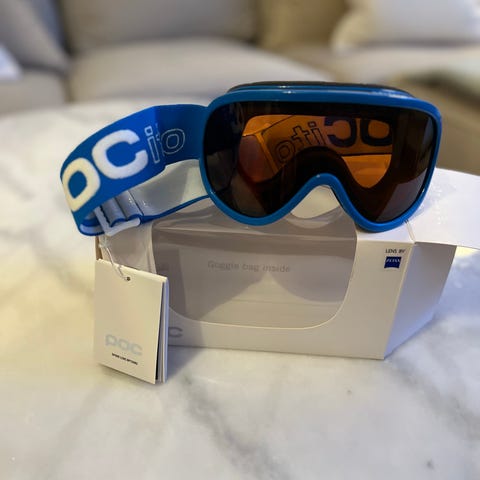 POC skidglasögon med blått band och blå tonad lins. Till glasögonen ingår ett hårt fodral med dragkedja och orange insida för skydd vid förvaring och transport. Utrustningen är avsedd för alpin skidåkning