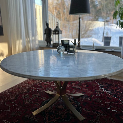 Vackert och dekorativt vardagsrumsbord med rund skiva i marmor och stomme i mässing