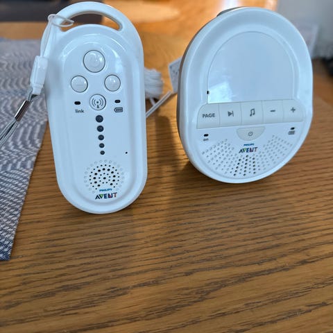 Består av en föräldraenhet och en barnenhet för ljudövervakning av baby. Använder DECT-teknik för tydlig ljudöverföring och minskad störning. Enheterna har indikatorlampor och knappar för volym och funktioner på framsidan. Avsedd för inomhusbruk för övervakning av spädbarn och små barn.