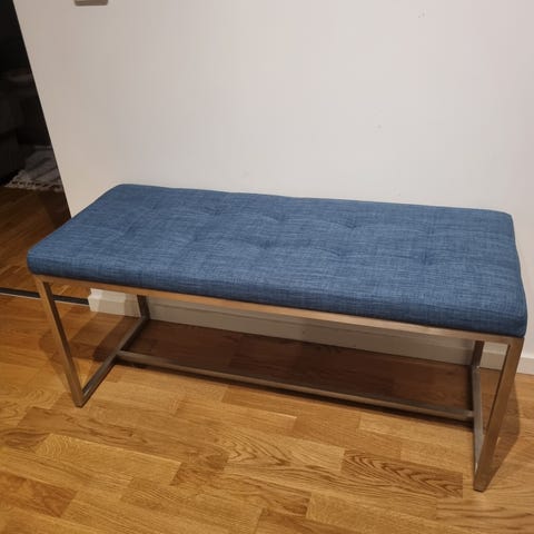 Mycket snygg och stilren bänk som passar i t ex hall eller sovrum. Ljust gråblå stoppad sits: