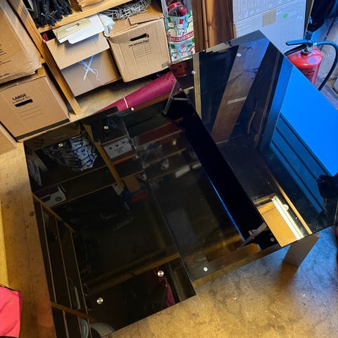 Jotex soffbord med bordsskiva i glas och underrede i svart metall. Bordet har smala, vinklade ben som ger ett lätt och luftigt intryck. Passar som soffbord i vardagsrum eller loungeyta.
